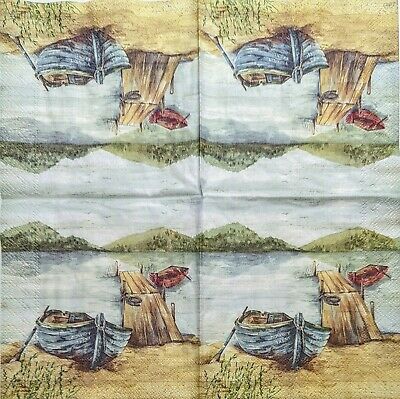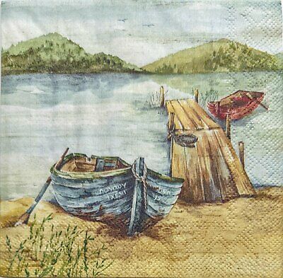 TWO Individual Paper Cocktail Decoupage Napkins - 1948 Rowboat by the Dock