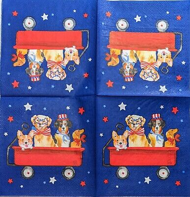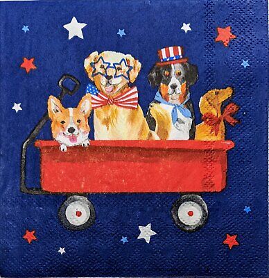 TWO Individual Paper Cocktail Decoupage Napkins - 1988 Patriotic Dogs in Wagon