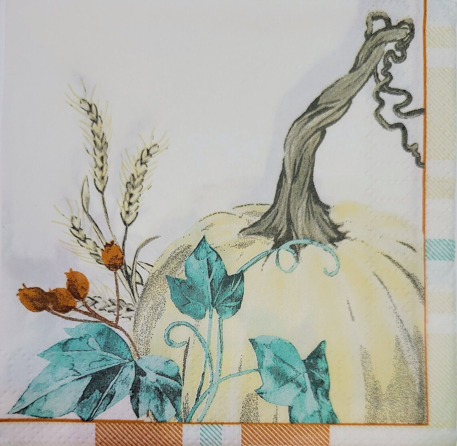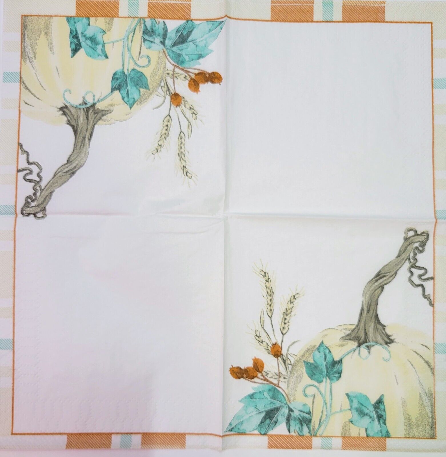 TWO Individual Paper Cocktail Decoupage Napkins - 2168 Cream Pumpkin w Turquoise