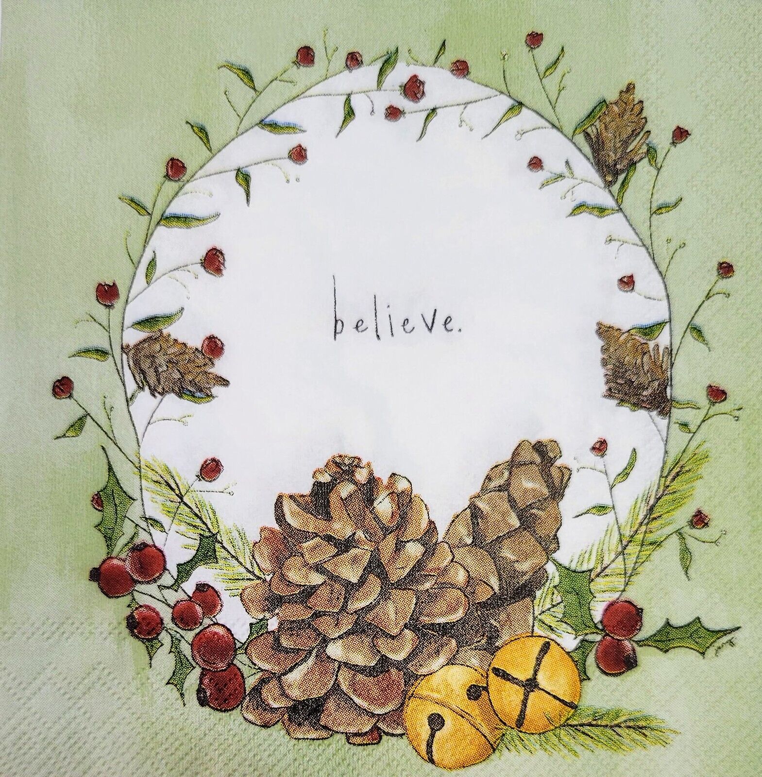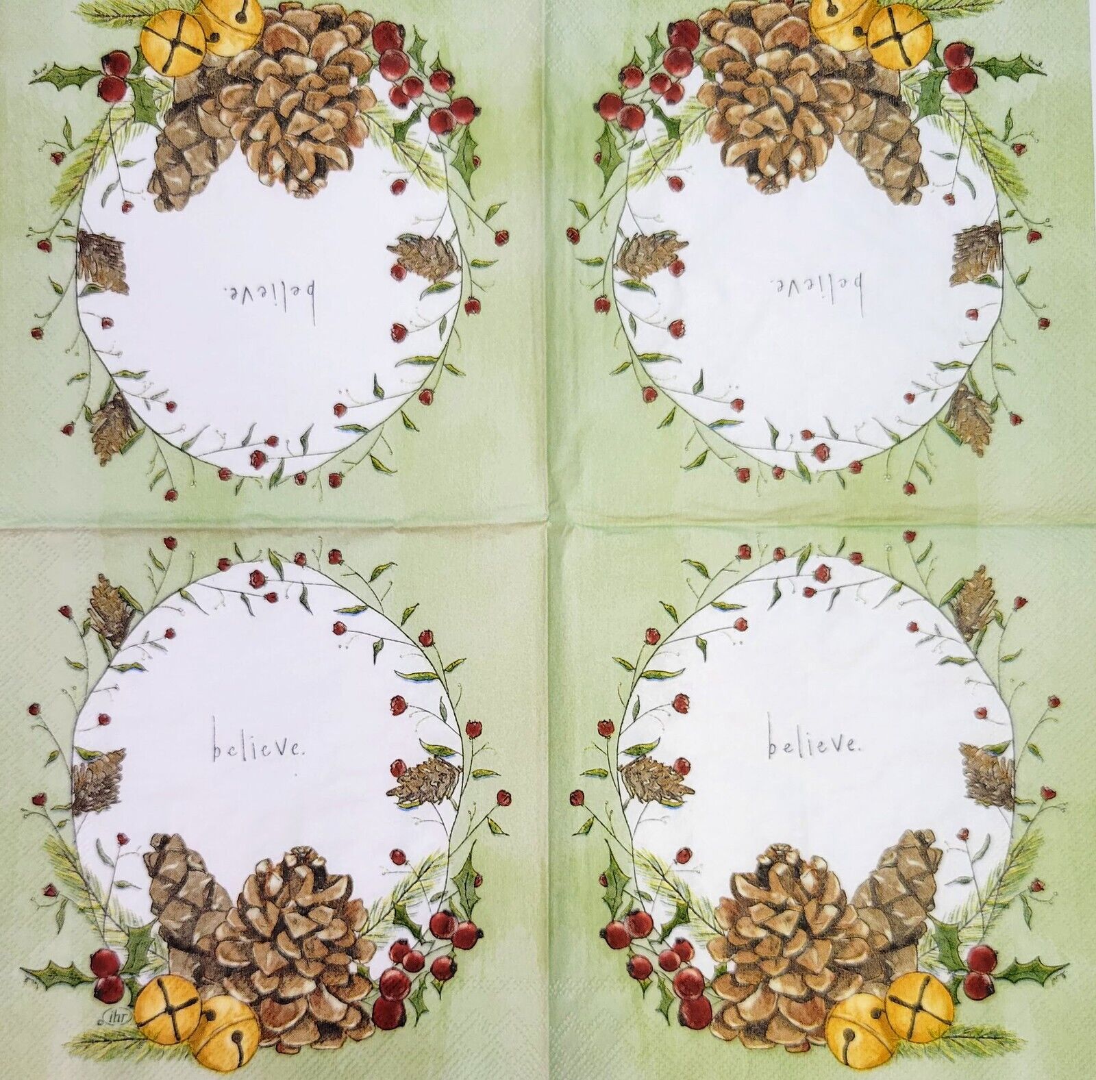 TWO Individual Paper Cocktail Decoupage Napkins - 2177 Believe Pinecone Wreath