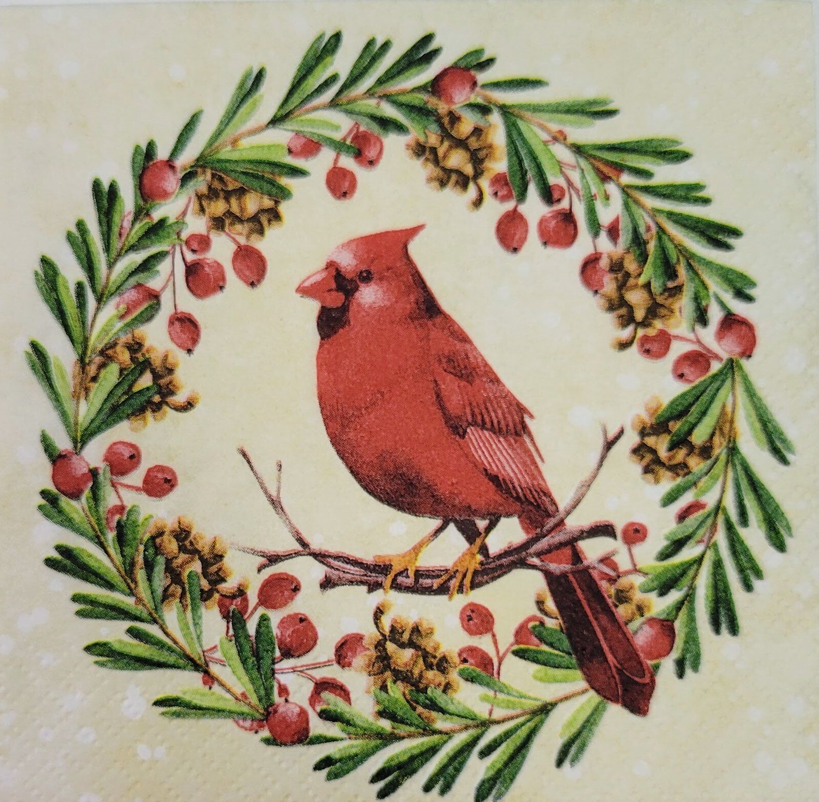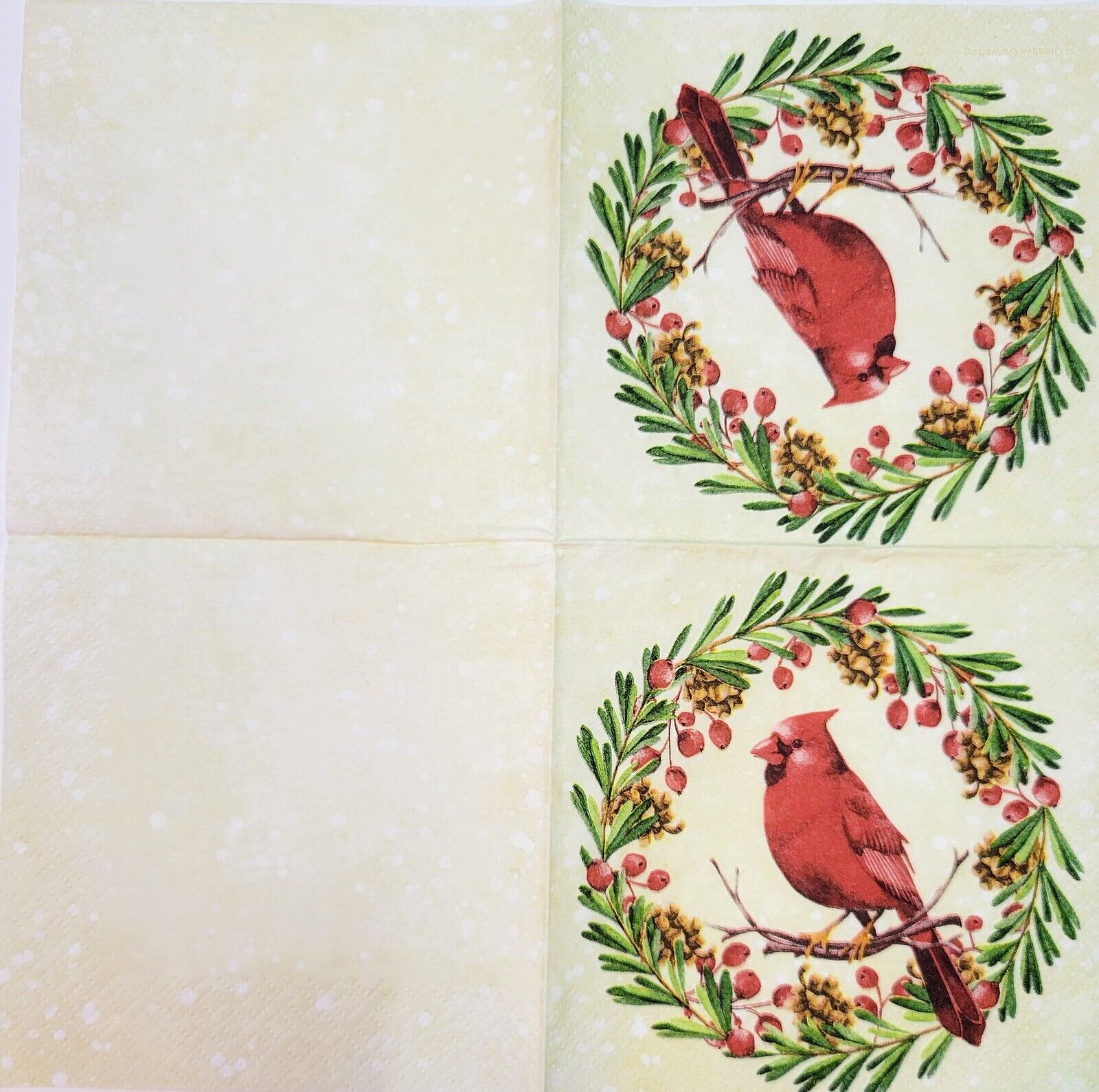 TWO Individual Paper Cocktail Decoupage Napkins - 2178 Cardinal Christmas Wreath