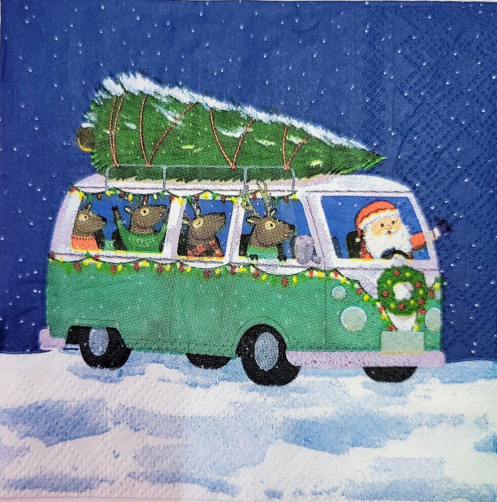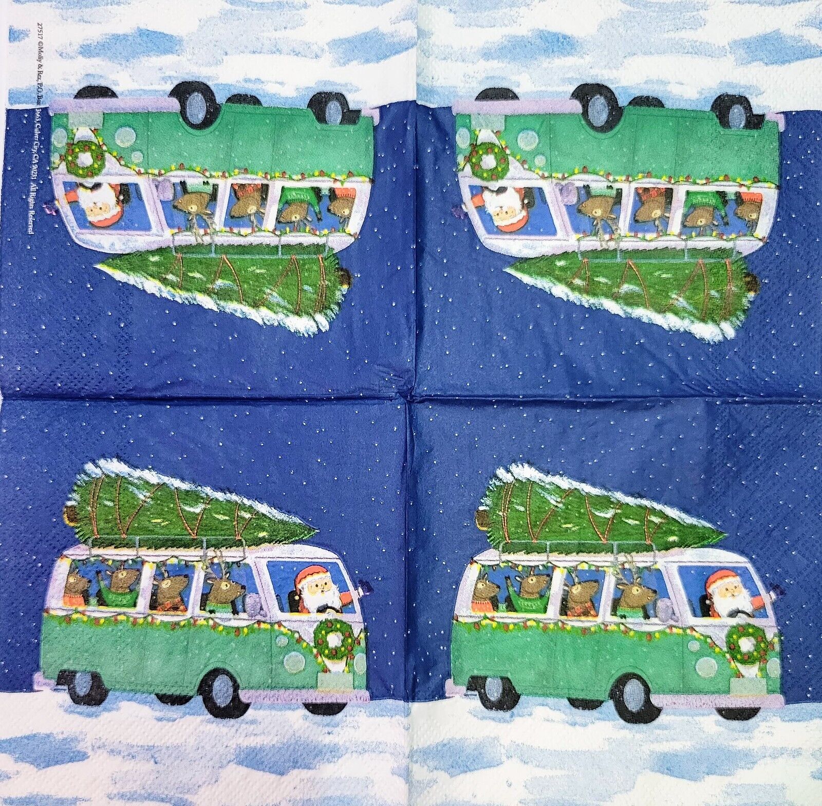 TWO Individual Paper Cocktail Decoupage Napkins - 2186 Santa's Christmas Bus