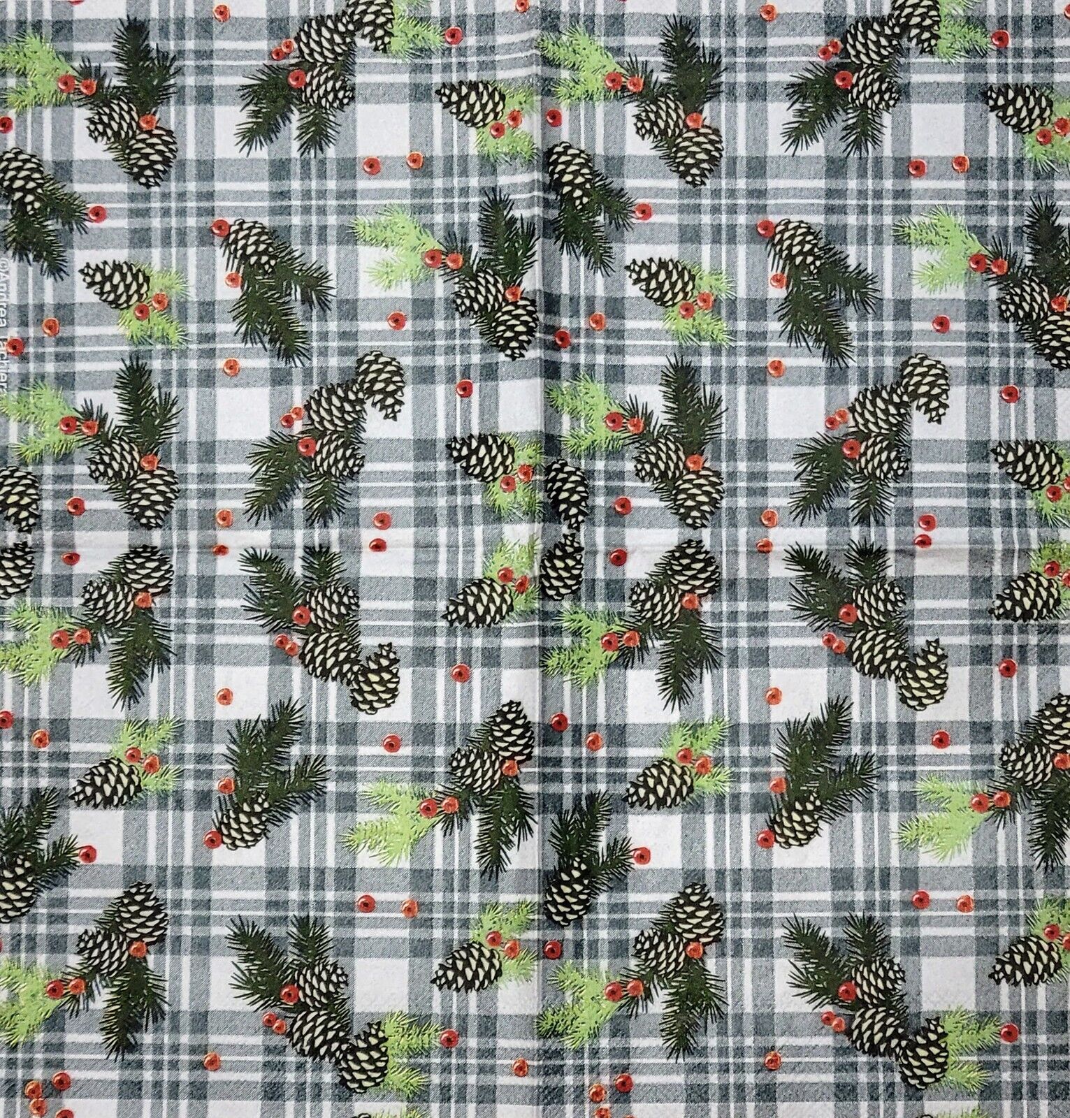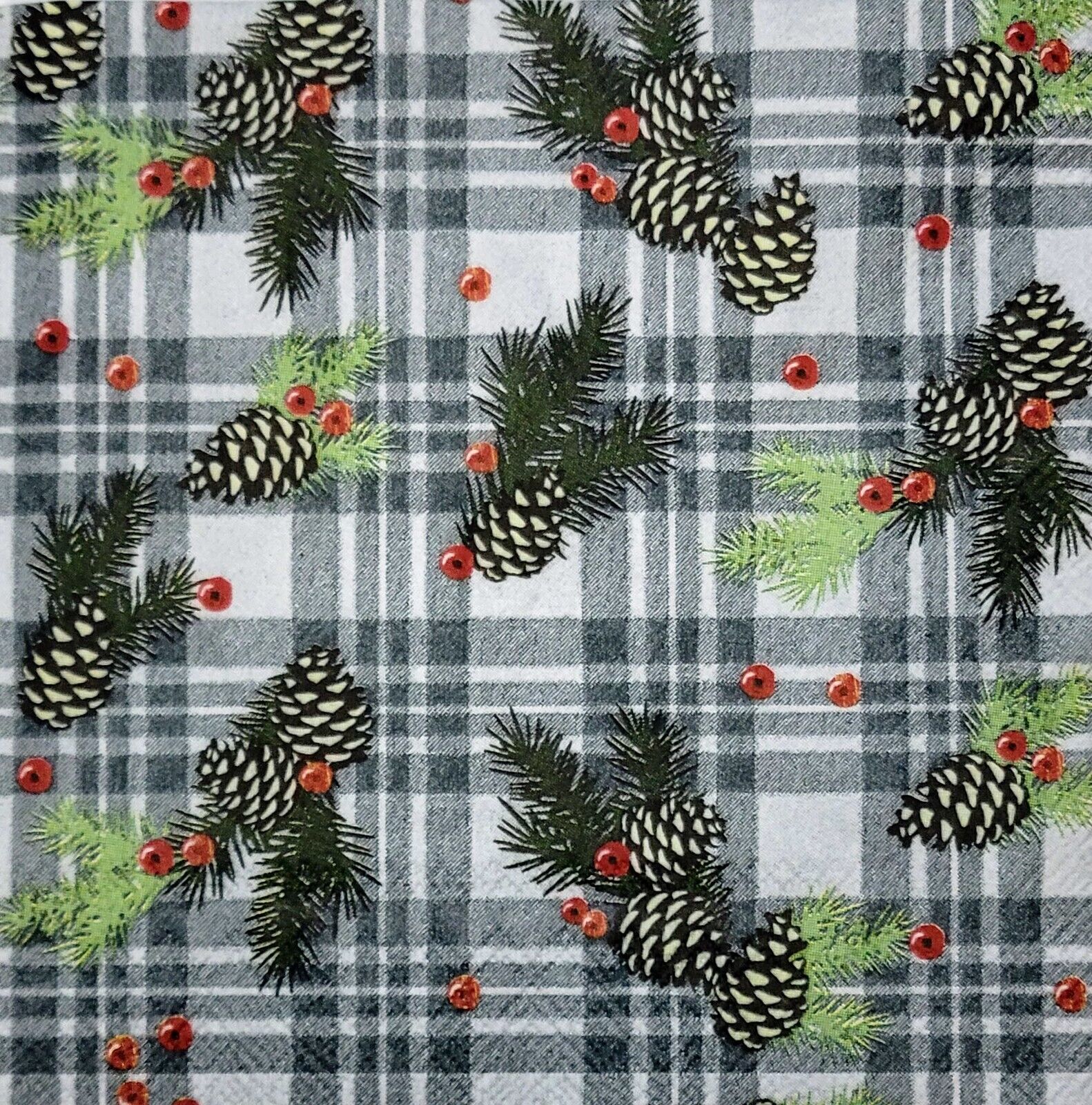 TWO Individual Paper Cocktail Decoupage Napkins - 2285 Plaid Woodland Pinecone