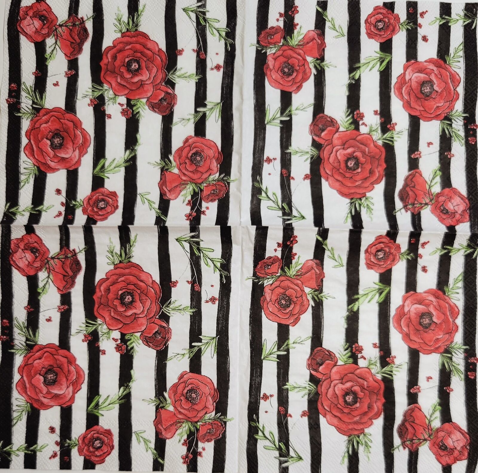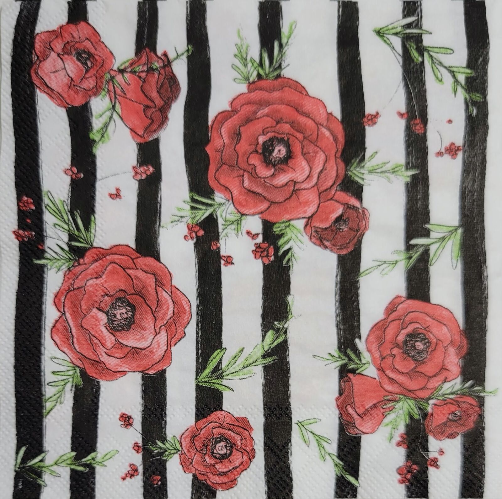 TWO Individual Paper Cocktail Decoupage Napkins - 2397 Red Peonies & Stripes