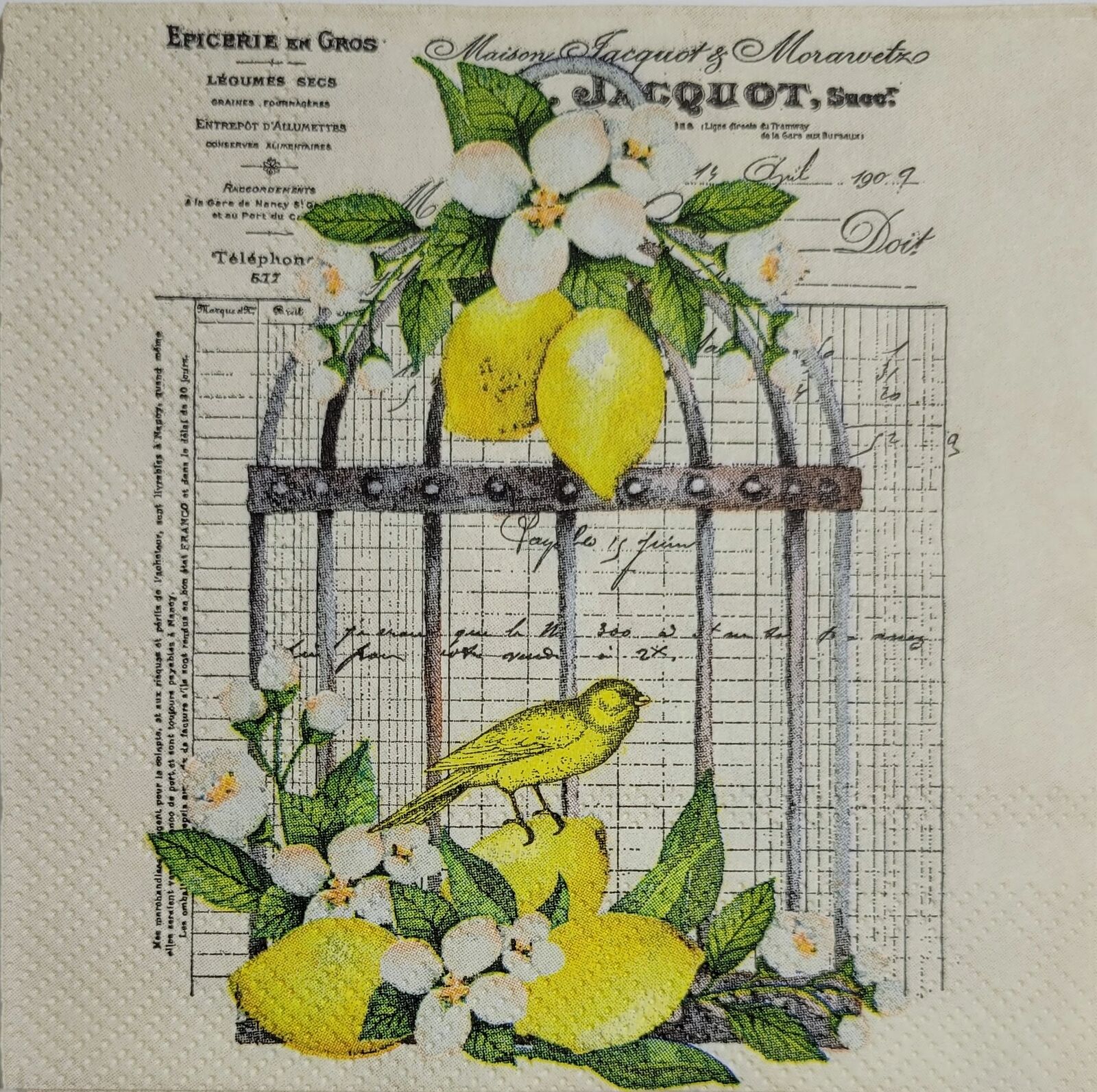 TWO Individual Paper Cocktail Decoupage Napkins - 2398 Lemon Birdcage w Script