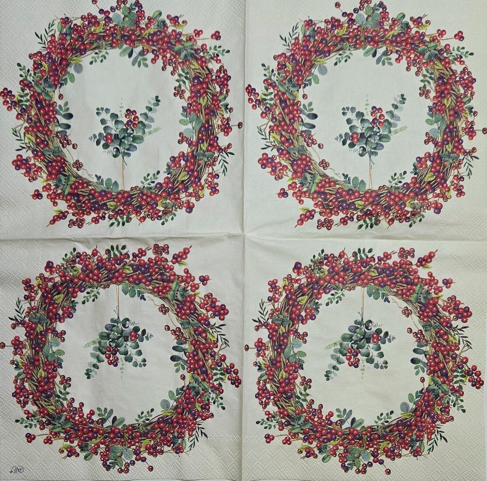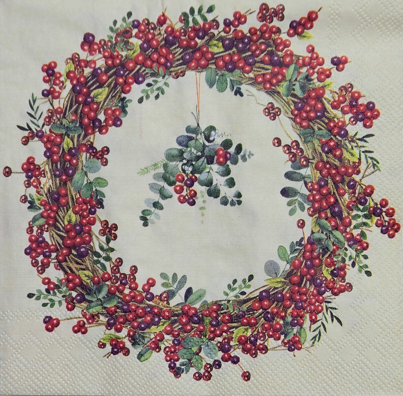 TWO Individual Paper Cocktail Decoupage Napkins- 2579 Red Berry Wreath
