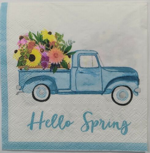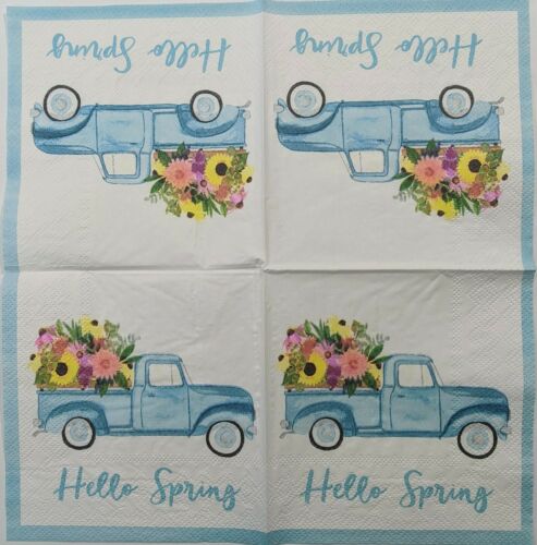 TWO Individual Paper Cocktail/Party 4.75" x 4.75" 2-ply Decoupage Napkin - Blue Truck Hello Spring. Shabby Chic. Light blue truck hauling spring flowers.