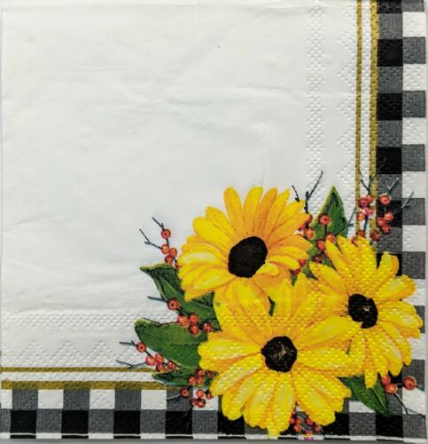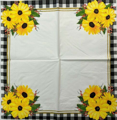 TWO Individual Paper Cocktail Decoupage Napkins- Floral Black/White Gingham 1282
