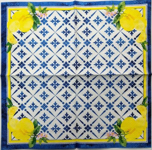 TWO Individual Paper Cocktail Decoupage Napkins- Lisbon Lemons Blue/Yellow 1101