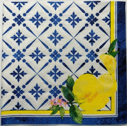 TWO Individual Paper Cocktail/Party 4.92" x 4.92" 3-ply Decoupage Napkin -Lisbon Lemons Blue/Yellow Pink flowers.