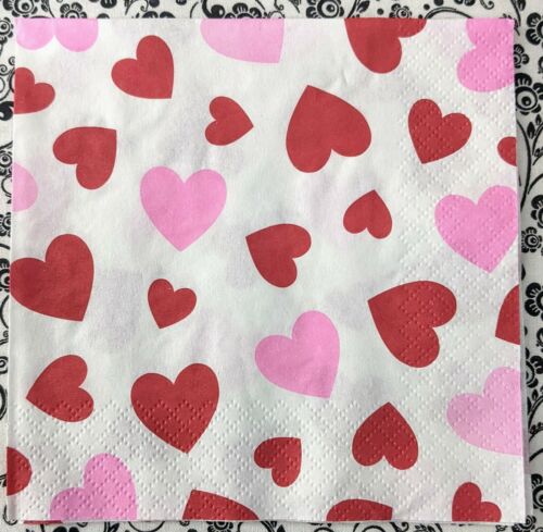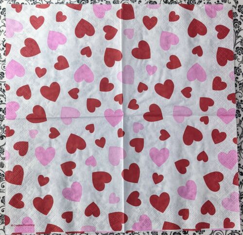 TWO Individual Paper Cocktail/Party 4.75" x 4.75" 2-ply Decoupage Napkin - Red and Pink Valentine Hearts cover this cocktail napkin.