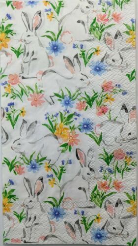 TWO Individual Paper Guest 16" x 11.5", 3-ply Decoupage Napkin - Easter Bunnies Flower Patch