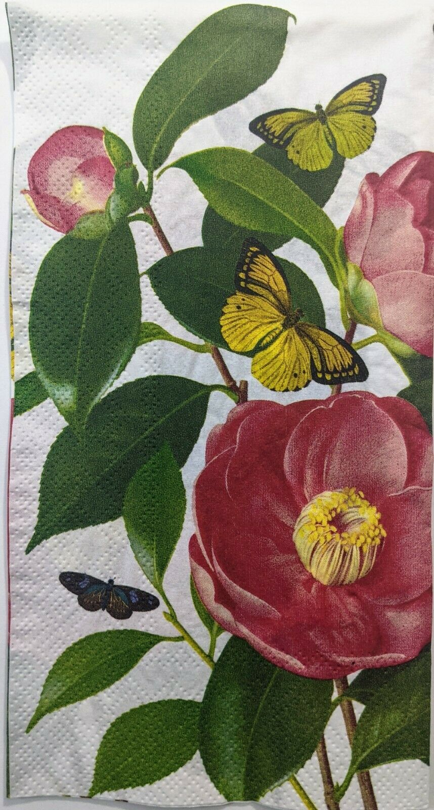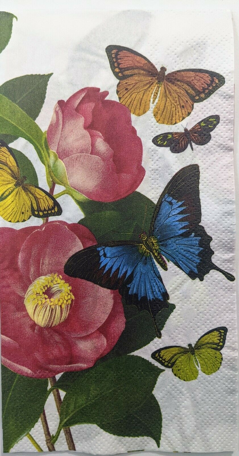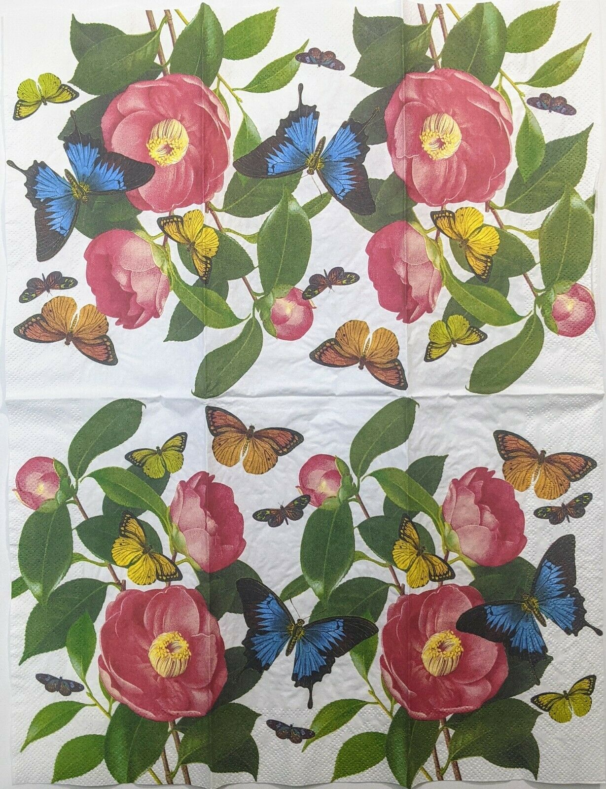 TWO Individual Paper Guest 16" x 11.5", 3-ply Decoupage Napkin - Glamorous Spring Flowers. Butterflies fluttering.