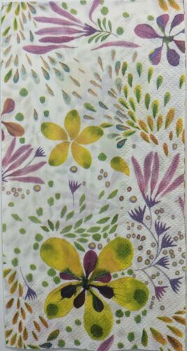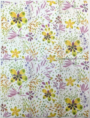 TWO Individual Paper Guest 16" x 11.5", 3-ply Decoupage Napkin - Linda. Spring flower explosion. Yellow, green and purple.