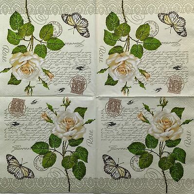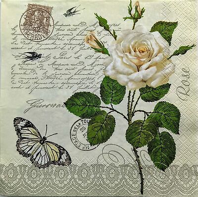 TWO Individual Paper Lunch Decoupage Napkins - 1374 Vintage Rose w/ Butterfly